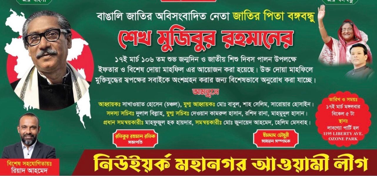 হাকিকুল ইসলাম খোকন,বাপসনিউজ: জাতির পিতা বঙ্গবন্ধু শেখ মুজিবুর রহমানের ১০৬তম জন্মবার্ষিকী ও জাতীয় শিশু দিবস ২০২৬ উপলক্ষে, ১৭মার্চ ২০২৬,মঙ্গলবার,বিকাল ৫টায় নিউইয়র্ক মহানগর আওয়ামী লীগ কর্তৃক আয়োজিত আলোচনা সভা ও ইফতার মাহফিল এবং বিশেষ দোয়া মাহফিল এর আযোজন করা হয়েছে ।খবর আইবিএননিঊজ। লাবণ্য পার্ট হল,১১৯৫ লিভারটি এভিনিউ,ওজন পার্ক নিউইয়র্ক এ অনুষ্ঠিত Details..