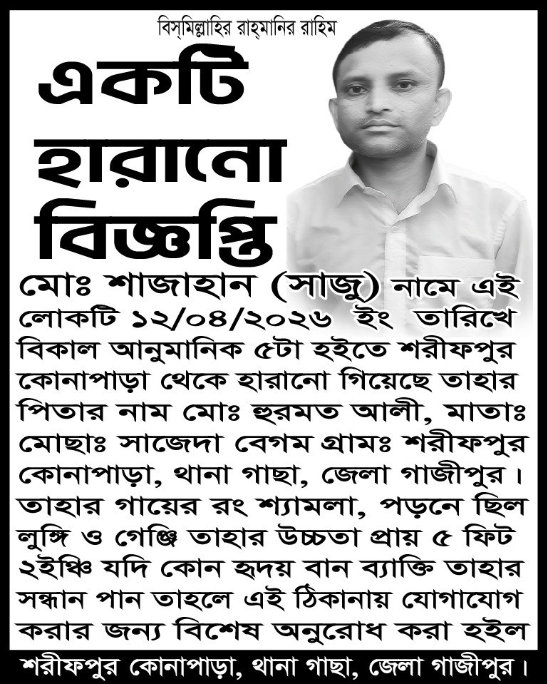 মোছাঃ নাছিমা খাতুন সুলতানা: ময়মনসিংহ জেলার গৌরীপুর উপজেলার ৪ নং মাওহা ইউনিয়ন ৮ নং ওয়ার্ডের বড়িইয়া কান্দা দক্ষিণ পাড়া গ্রামের মৃত জালাল উদ্দিন এর ছেলে সন্ত্রাসী মোঃ রুবেল বাহিনীর হাত থেকে রেহাই পেতে চায় রিপন মিয়া সহ তার পরিবারবর্গ। সূত্রে জানা যায় একই গ্রামের আব্দুল হামিদ এর ছেলে মোঃ রিপন Details..