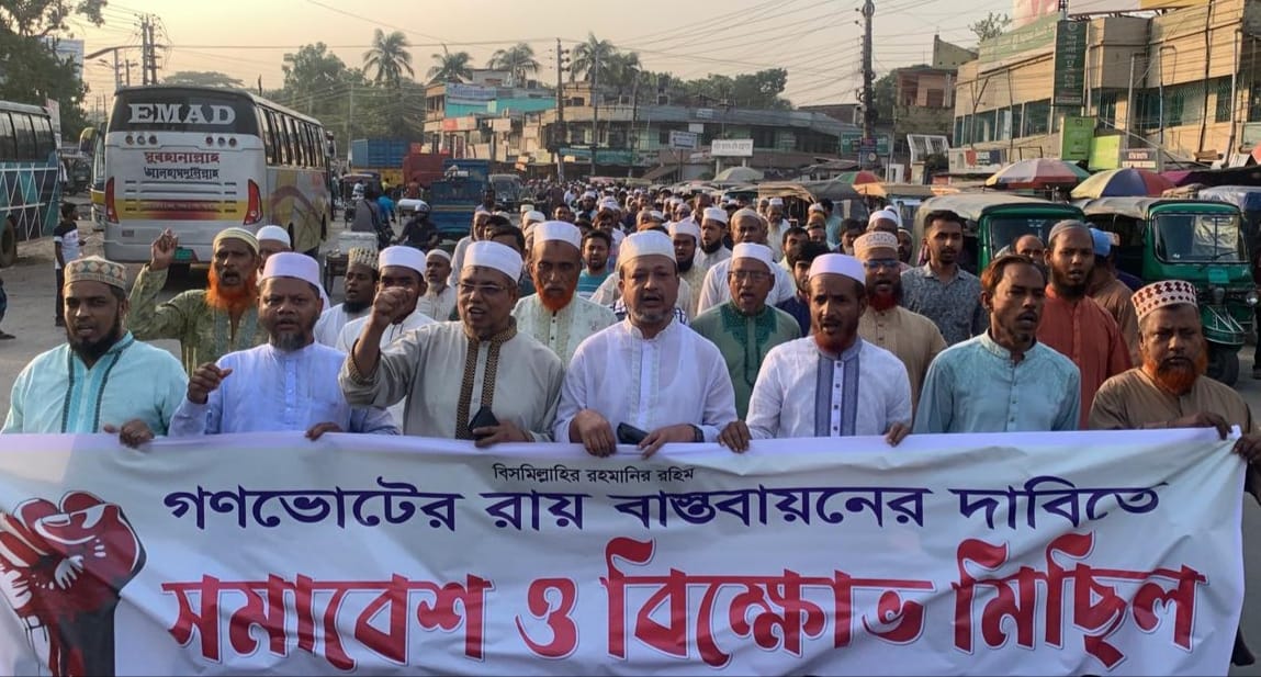 ত্রায়োদশ জাতীয় সংসদ নির্বাচনের গণ রায় ও জুলাই সনদ বাস্তবায়নের দাবীতে আজ ১২ই এপ্রিল ২০২৬ রবিবার, খুলনায় বিকাল ০৫:০০ টায় ফুলতলা উপজেলা এগারো দলীয় জোটের উদ্যোগে ফুলতলা বাজারে এক বিক্ষোভ সমাবেশ ও মিছিল অনুষ্ঠিত হয়। ফুলতলা উপজেলা জামায়াতের আমীর অধ্যাপক আবদুল আলিম মোল্লার সভাপতিত্বে অনুষ্ঠিত বিক্ষোভ মিছিল ও সমাবেশে প্রধান অতিথি হিসেবে উপস্থিত ছিলেন বাংলাদেশ জামায়াতে ইসলামী খুলনা জেলা সহকারী সেক্রেটারি প্রিন্সিপাল গাওসুল আযম হাদী।