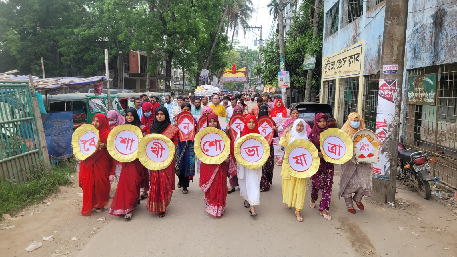 শোভাযাত্রায় ছিল গ্রামীণ সংস্কৃতির প্রতীক, মুখোশ, ফেস্টুন ও ব্যানার, যা নতুন বছরের আগমনী বার্তা বহন করে।